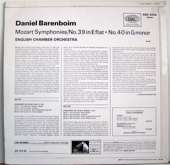 Daniel Barenboim, English Chamber Orchestra - Mozart Symphonies: No. 39 In E Flat, K.543; No. 40 G Minor, K.550 (LP)