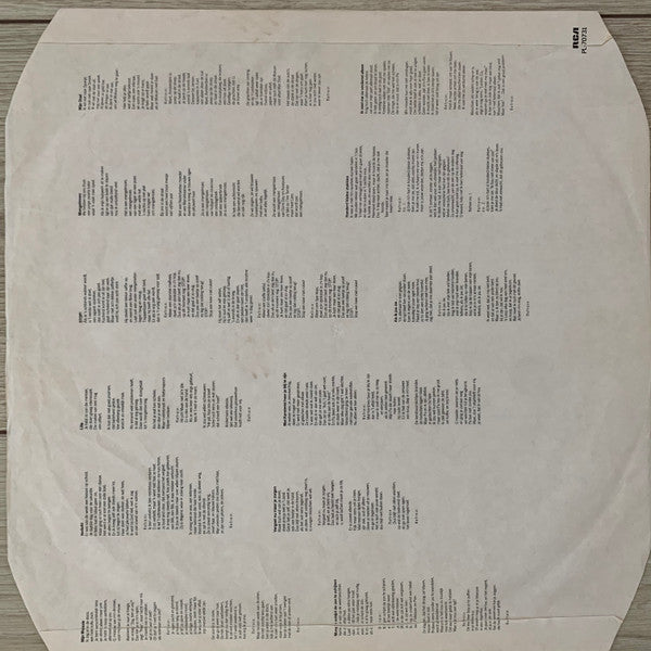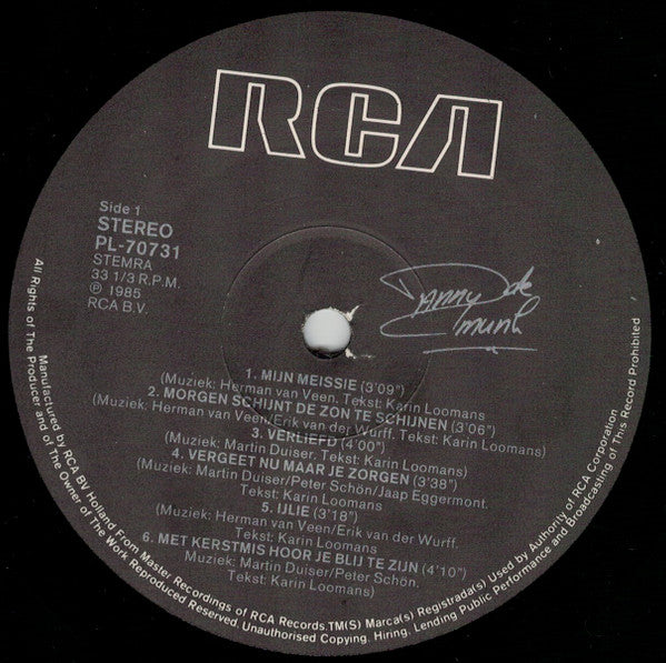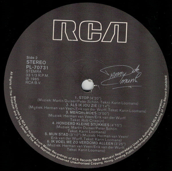 (P)+(C) 1985 RCA BV, manufactured by RCA BV Holland. Recorded and mixed at Soundpush Studio's in Blaricum, Holland. Designed at Spiral Studio Amsterdam. Comes with printed inner sleeve; lyrics printed on one side (black ink on white sleeve), the other side is blank.
