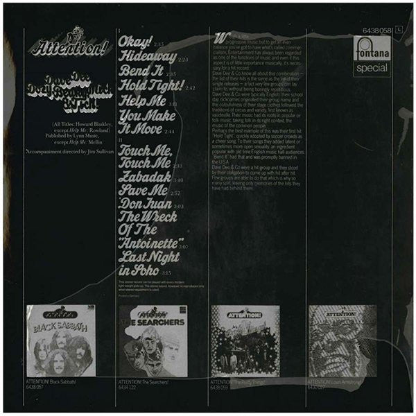 A1. Okay! 2:35 A2. Hideaway 2:23 A3. Bend It 2:35 A4. Hold Tight! 2:42 A5. Help Me 3:11 A6. You Make It Move 2:44 B1. Touch Me, Touch Me 2:33 B2. Zabadak 3:40 B3. Save Me 2:57 B4. Don Juan 3:03 B5. The Wreck Of The "Antoinette" 3:07 B6. Last Night In Soho 3:15
