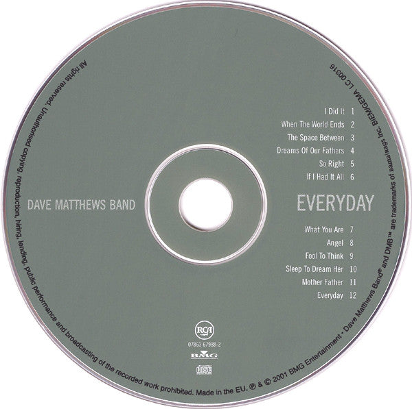 Mixed at Image Studios, Hollywood, California. Recorded at Conway Studios, Hollywood, California. Mastered at Gateway Mastering, Portland, Maine. Made in the EU. Some copies came with a stickered slipcase. The sticker reading: DAVE MATTHEWS BAND EVERYDAY 07863 67988-2/4 The new studio album featuring I DID IT THE SPACE BETWEEN WHEN THE WORLD ENDS ANGEL