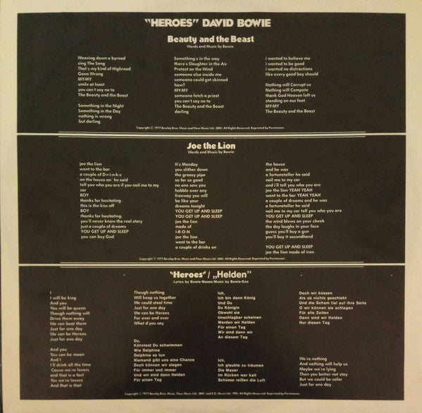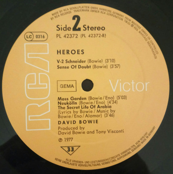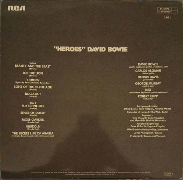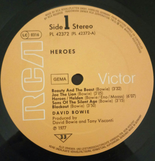 A1. Beauty And The Beast 3:32 A2. Joe The Lion 3:05 A3. "Heroes" 6:07 A4. Sons Of The Silent Age 3:15 A5. Blackout 3:50 B1. V-2 Schneider 3:10 B2. Sense Of Doubt 3:57 B3. Moss Garden 5:03 B4. Neuköln 4:34 B5. The Secret Life Of Arabia 3:46