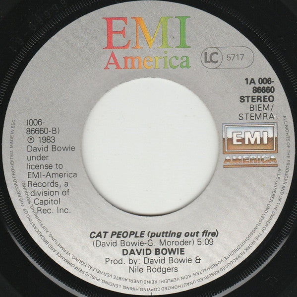 Labels: ℗ 1983 David Bowie under license to EMI-America Records a division of Capitol Rec. Inc. Made in EEC Back cover: ℗ 1983 David Bowie under license to EMI America Records, a division of Capitol Records Inc. © 1983 David Bowie under license to EMI America Records, a division of Capitol Records Inc. Printed in Holland by EMI Services Benelux B.V., Uden. There is also a misprinted version of this release that lacks all white ink/details on the front cover.