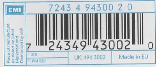 Barcode 7 24349 43002 0Rights Society bel BIEMLabel Code LC0542Price Code 070Price Code PM 520Mastering SID Code IFPI L047Matrix / Runout EMI UDEN 4943002 @ 1 1-3-1-NLMatrix / Runout EMI UDEN 4943002 @ 1 1-1-6-NLMould SID Code ifpi 1596Matrix / Runout EMI UDEN 4943002 @ 1 1-3-3-NLMastering SID Code IFPI L047Mould SID Code ifpi 1593Matrix / Runout EMI UDEN 4943002 @ 1 1-3-7-NLMastering SID Code IFPI L047Mould SID Code ifpi 15E1