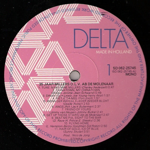 A1. Tune: Make Mine Millers 0:47 A2. Chinatown, My Chinatown 0:49 A3. Dinah 1:57 A4. Pietje, Ga Je Mee? 1:57 A5. Wenn Der Weisse Flieder Wieder Blüht 2:53 A6. Angelina 2:37 A7. A Friend Of Yours 2:41 A8. Get Up Those Stairs 2:47 A9. Beat Me Pia, Eight To The Bar 2:36 A10. Flying Home 2:50 A11. Hair Of Gold, Eyes Of Blue 3:51 B1. Body And Soul 2:53 B2. Den Lille Ole 2:45 B3. Perdido 1:26 B4. Sioux City Sue 2:17 B5. Honey 2:08 B6. Solitude 3:19 B7. Mobile 2:09 B8. Some Sunday Morning 2:41 B9. The Preacher 2:09 B10. Tune: Make Mine Millers 0:48