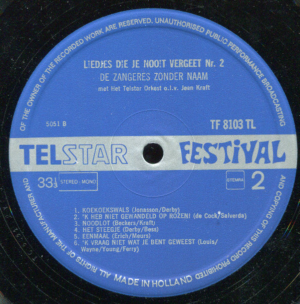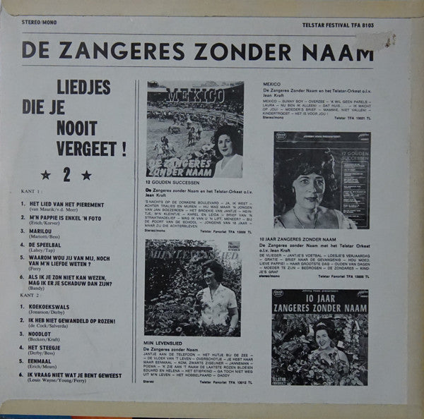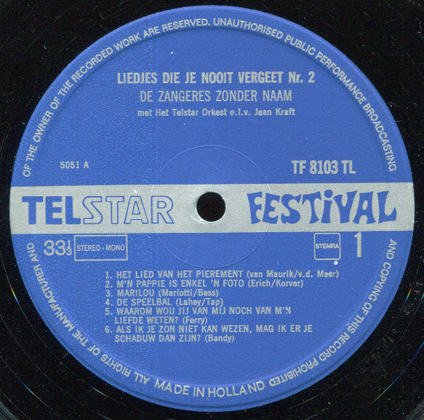 A1. Het Lied Van Het Pierement A2. M'n Pappie Is Enkel Een Foto A3. Marilou A4. De Speelbal A5. Waarom Wou Jij Van Mij, Noch Mijn Liefde Weten? A6. Als Ik Je Zon Niet Kan Wezen, Mag Ik Er Je Schaduw Dan Zijn? B1. Koekoekswals B2. Ik Heb Niet Gewandeld Op Rozen! B3. Noodlot B4. Het Steegje B5. Eenmaal B6. Ik Vraag Niet Wat Je Bent Geweest