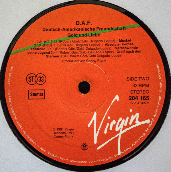 recorded August/September 81 im C. Plank Studio. artwork: Ken At A.S. published by Wintrup Musik. [on inner sleeve ℗ & © 1981 Virgin Records Limited Distributed by Ariola Group of Companies Printed in Western Germany by Mohndruck Graphische Betriebe GmbH, Gütersloh [on rear sleeve © 1981 Virgin Records Ltd./Conny Plank Ariola-Eurodisc GmbH, München [on labels Catalog number "204 165-320" on backcover and spine, "204 165" on labels. Includes a printed inner sleeve