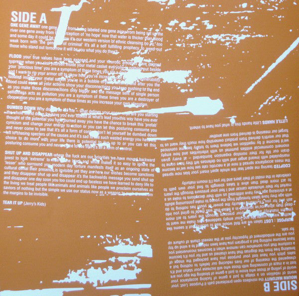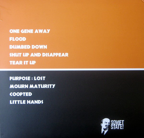 A1. One Gene Away A2. Flood A3. Dumbed Down A4. Shut Up And Disappear A5. Tear It Up B1. Purpose : Lost B2. Mourn Maturity B3. Coopted B4. Little Hands