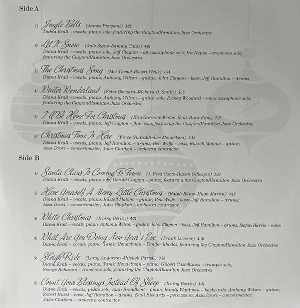 A1. Jingle Bells 3:26 A2. Let It Snow 4:01 A3. The Christmas Song 4:24 A4. Winter Wonderland 3:15 A5. I'll Be Home For Christmas 3:07 A6. Christmas Time Is Here 3:35 B1. Santa Claus Is Coming To Town 2:53 B2. Have Yourself A Merry Little Christmas 4:19 B3. White Christmas 4:31 B4. What Are You Doing Newyear's Eve 4:10 B5. Sleigh Ride 3:26 B6. Count Your Blessings Instead Of Sheep 3:41