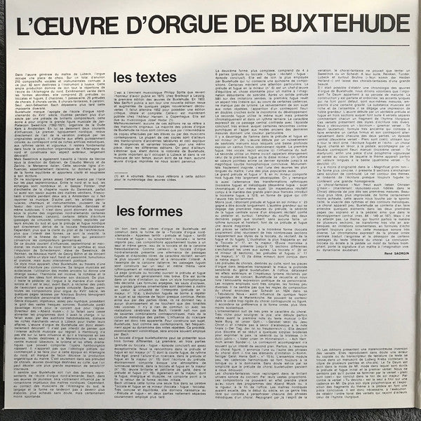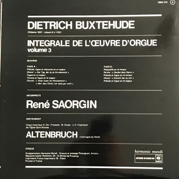 A1. Prélude, Fugue Et Chaconne En Ut Majeur A2. Choral: "Der Tag, Der Ist So Freudenreich" A3. Fugue En Ut Majeur A4. Toccata Et Fugue En Fa Majeur A5. Chorals: "Vater Unser Im Himmelreich" A6. Chorals: "Herr Jesu Christ, Ich Weiss Gar Wohl" B1. Passacaille En Ré Mineur B2. Partita: "Danket Dem Herrn" B3. Prélude Et Fugue En Ré Mineur B4. Choral: "Kommt Her Zu Mir" B5. Prélude Et Fugue En Ré Majeur