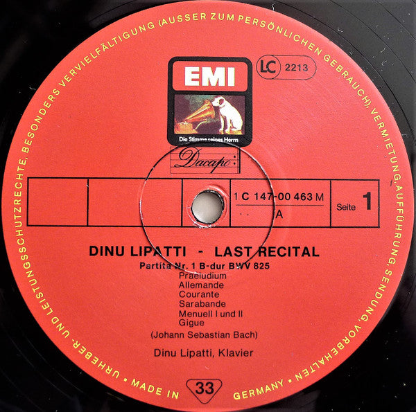 "EMI His Master's Voice" logo on front, with green rim, with "Dacapo" logo bellow.
