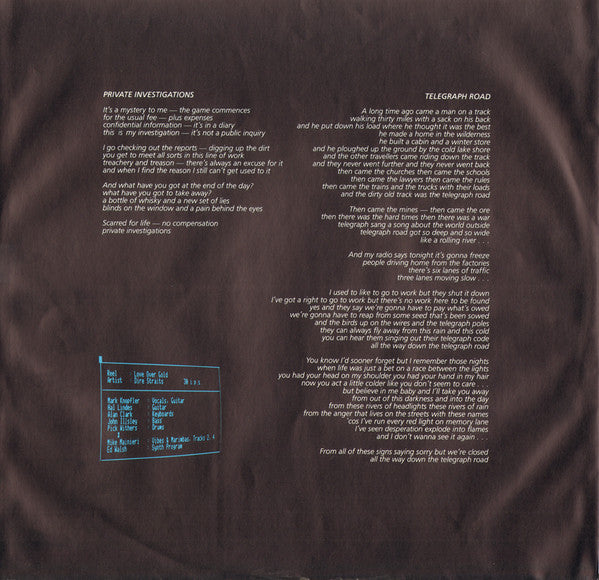 A1. Telegraph Road 14:20 A2. Private Investigations 7:00 B1. Industrial Disease 5:50 B2. Love Over Gold 6:15 B3. It Never Rains 7:55