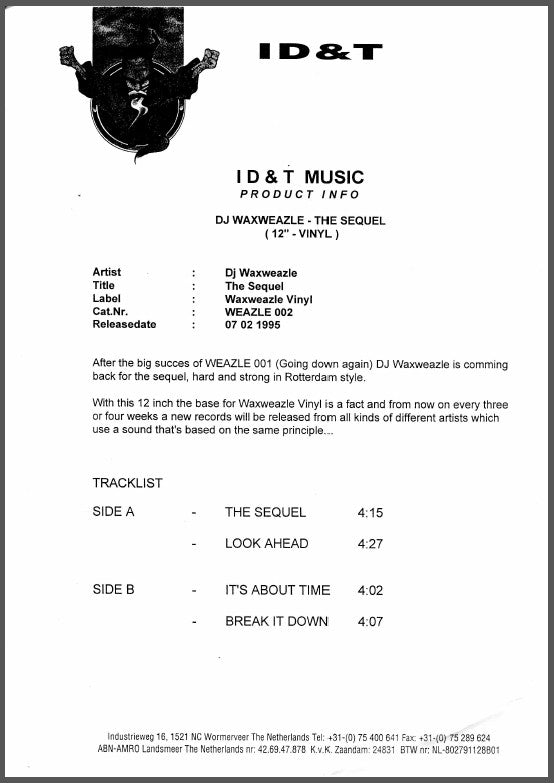 Marketed by ID&T Music ID&T Veranstaltungen GmbH Official catalog number of this release is WEAZLE2 and not WAX2. A2 samples "Pump Up The Jam" by [a14457 Featuring [a29236.