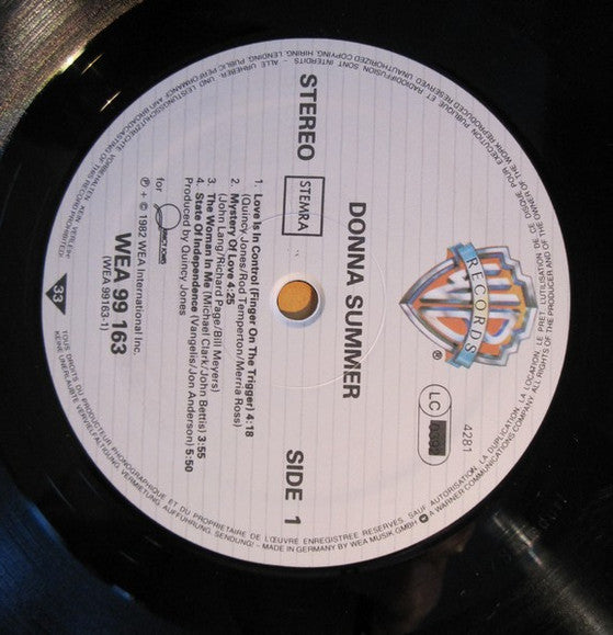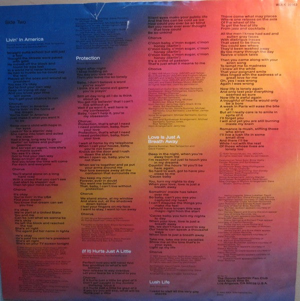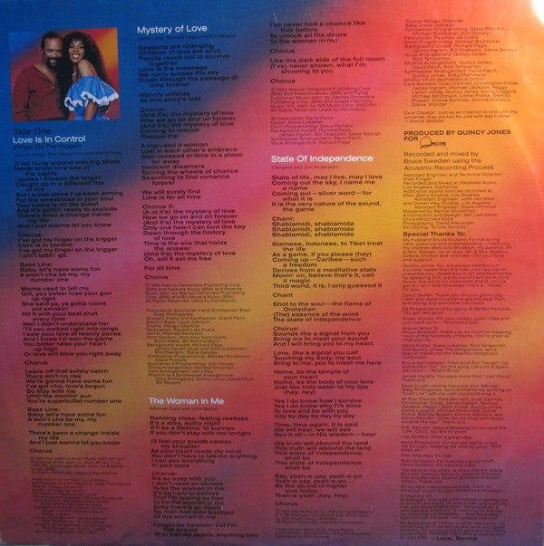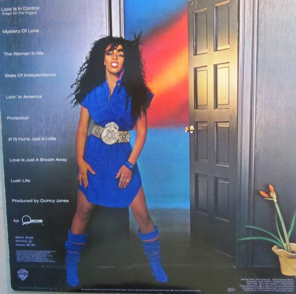 A1. Love Is In Control (Finger On The Trigger) 4:18 A2. Mystery Of Love 4:25 A3. The Woman In Me 3:55 A4. State Of Independence 5:50 B1. Livin' In America 4:41 B2. Protection 3:35 B3. (If It) Hurts Just A Little 3:52 B4. Love Is Just A Breath Away 3:55 B5. Lush Life 6:26