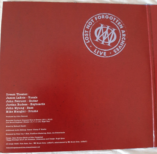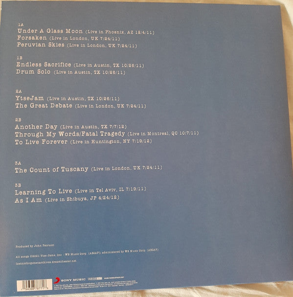 A1. Under A Glass Moon (Live In Phoenix, AZ 12/4/11) 7:17 A2. Forsaken (Live In London, UK 7/24/11) 5:46 A3. Peruvian Skies (Live In London, UK 7/24/11) 7:00 B1. Endless Sacrifice (Live In Austin, TX 10/26/11) 11:57 B2. Drum Solo (Live In Austin, TX 10/26/11) 6:46 C1. YtseJam (Live In Austin, TX 10/26/11) 6:09 C2. The Great Debate (Live In London, UK 7/24/11) 14:30 D1. Another Day (Live In Austin, TX 7/7/12) 4:29 D2. Through My Words / Fatal Tragedy (Live In Montreal, QC 10/7/11) 8:11 D3. To Live Forever (Live In Huntington, NY 7/19/12) 6:09 E1. The Count Of Tuscany (Live In London, UK 7/24/11) 21:48 F1. Learning To Live (Live In Tel Aviv, IL 7/19/11) 12:26 F2. As I Am (Live In Shibuya, JP 4/24/12) 8:12 CD1-1. Under A Glass Moon (Live In Phoenix, AZ 12/4/11) 7:16 CD1-2. Forsaken (Live In London, UK 7/24/11) 5:45 CD1-3. Peruvian Skies (Live In London, UK 7/24/11) 6:59 CD1-4. Endless Sacrifice (Live In Austin, TX 10/26/11) 11:57 CD1-5. Drum Solo (Live In Austin, TX 10/26/11) 6:45 CD1-6. YtseJam (Live In Austin, TX 10/26/11) 6:09 CD1-7. The Great Debate (Live In London, UK 7/24/11) 14:29 CD2-1. Another Day (Live In Austin, TX 7/7/12) 4:29 CD2-2. Through My Words / Fatal Tragedy (Live In Montreal, QC 10/7/11) 8:11 CD2-3. To Live Forever (Live In Huntington, NY 7/19/12) 6:08 CD2-4. The Count Of Tuscany (Live In London, UK 7/24/11) 21:47 CD2-5. Learning To Live (Live In Tel Aviv, IL 7/19/11) 12:25 CD2-6. As I Am (Live In Shibuya, JP 4/24/12) 8:11