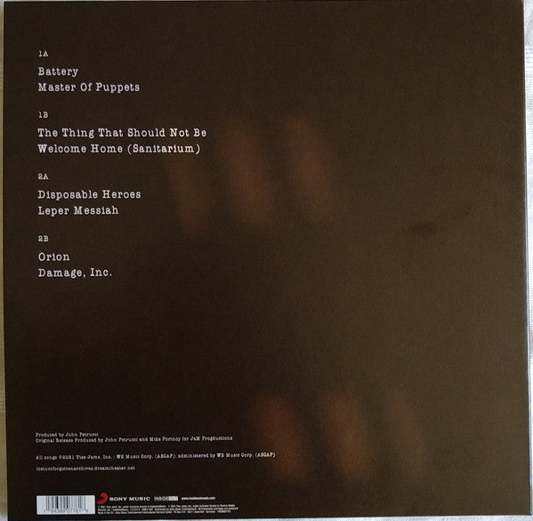 A1. Disposable Heroes 2A2. Leper Messiah 2B1. Orion 2B2. Damage, Inc. CD-1. Battery CD-2. Master Of Puppets CD-3. The Thing That Should Not Be CD-4. Welcome Home (Sanitarium) CD-5. Disposable Heroes CD-6. Leper Messiah CD-7. Orion CD-8. Damage, Inc.