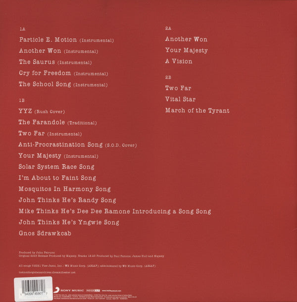 A1. Particle E. Motion (Instrumental) A2. Another Won (Instrumental) A3. The Saurus (Instrumental) A4. Cry For Freedom (Instrumental) A5. The School Song (Instrumental) B1. YYZ B2. The Farandole (Traditional) B3. Two Far (Instrumental) B4. Anti-Procrastination Song B5. Your Majesty (Instrumental) B6. Solar System Race Song B7. I'm About To Faint Song B8. Mosquitos In Harmony Song B9. John Thinks He's Randy Song B10. Mike Thinks He's Dee Dee Ramone Introducing A Song Song B11. John Thinks He's Yngwie Song B12. Gnos Sdrawkcab C1. Another Won C2. Your Majesty C3. A Vision D1. Two Far D2. Vital Star D3. March Of The Tyrant CD-1. Particle E. Motion (Instrumental) 1:38 CD-2. Another Won (Instrumental) 5:26 CD-3. The Saurus (Instrumental) 1:23 CD-4. Cry For Freedom (Instrumental) 6:31 CD-5. The School Song (Instrumental) 6:12 CD-6. YYZ 4:03 CD-7. The Farandole (Traditional) 3:16 CD-8. Two Far (Instrumental) 5:40 CD-9. Anti-Procrastination Song 0:13 CD-10. Your Majesty (Instrumental) 3:56 CD-11. Solar System Race Song 0:17 CD-12. I'm About To Faint Song 0:09 CD-13. Mosquitos In Harmony Song 0:12 CD-14. John Thinks He's Randy Song 0:10 CD-15. Mike Thinks He's Dee Dee Ramone Introducing A Song Song 0:16 CD-16. John Thinks He's Yngwie Song 0:15 CD-17. Gnos Sdrawkcab 0:23 CD-18. Another Won 5:27 CD-19. Your Majesty 3:45 CD-20. A Vision 11:24 CD-21. Two Far 5:25 CD-22. Vital Star 5:44 CD-23. March Of The Tyrant 5:34