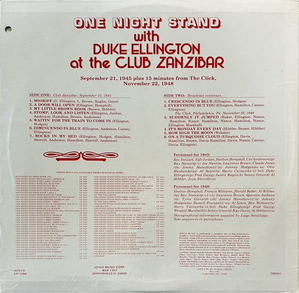 Tracks A1 to B2 were made during Duke Ellington's 1945 Cafe Zanzibar engagement, which ran from September 12 to December 4, 1945. The orchestra played three shows a night at 8 p.m., midnight and 2 a.m. The band broadcast regularly from the club (probably airing 15 minute slots seven days a week), and the Armed Forces Radio Service transcribed several programs in its 'One Night Stand' and 'Magic Carpet' series.