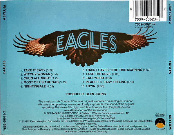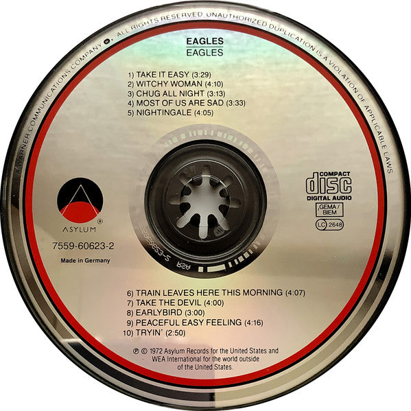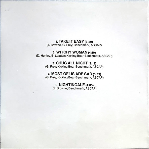 1. Take It Easy 3:292. Witchy Woman 4:103. Chug All Night 3:134. Most Of Us Are Sad 3:335. Nightingale 4:056. Train Leaves Here This Morning 4:077. Take The Devil 4:008. Earlybird 3:009. Peaceful Easy Feeling 4:1610. Tryin' 2:50