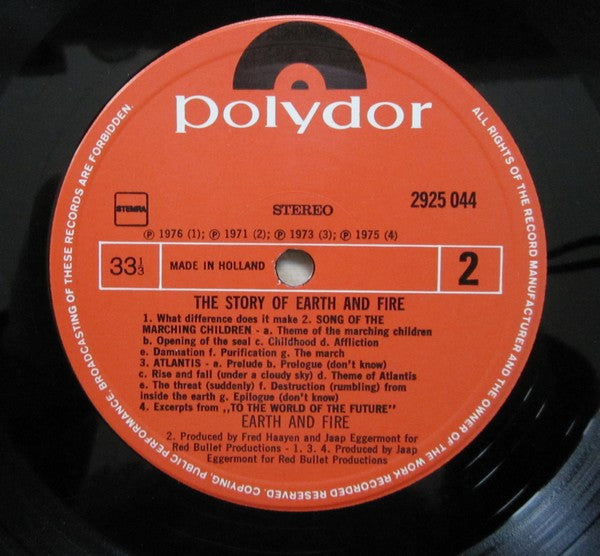 Van de TV Reklame! Made in Holland on labels Printed in Holland on back cover Main artist and title: The Story Of Earth & Fire on front cover The Story Of Earth And Fire on labels and spine The runouts are stamped.