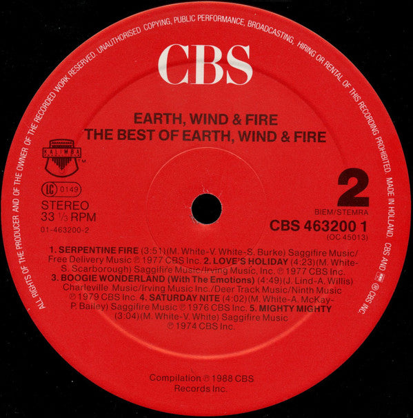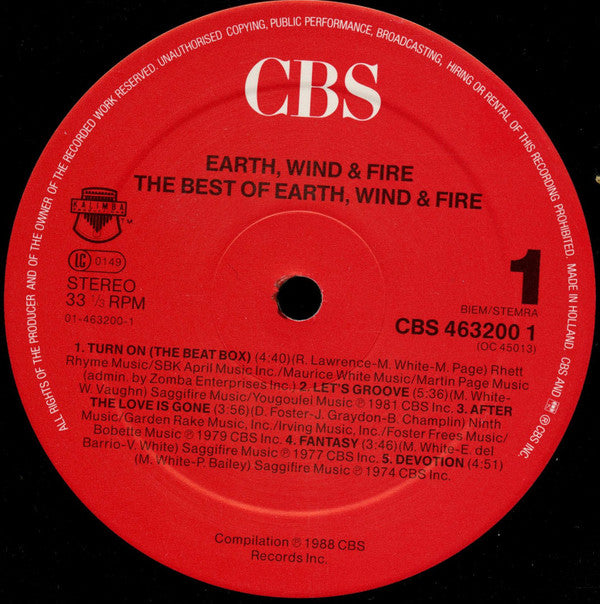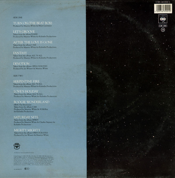 A1. Turn On (The Beat Box) 4:40 A2. Let's Groove 5:36 A3. After The Love Is Gone 3:56 A4. Fantasy 3:46 A5. Devotion 4:51 B1. Serpentine Fire 3:51 B2. Love's Holiday 4:23 B3. Boogie Wonderland 4:49 B4. Saturday Nite 4:02 B5. Mighty Mighty 3:04