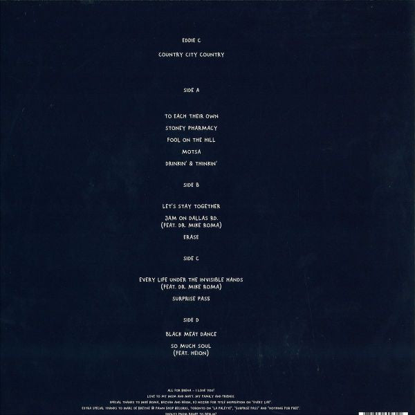 A1. To Each Their Own A2. Stoney Pharmacy A3. Fool On The Hill A4. Motsa A5. Drinkin' & Thinkin' B1. Let's Stay Together B2. Jam On Dallas Rd. B3. Erase C1. Every Life Under The Invisible Hands C2. Surprise Pass D1. Black Meat Dance D2. So Much Soul