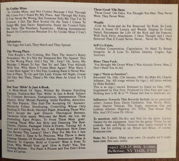 A1. So Unlike Mine A2. Infestation A3. The Wrong Place A4. But Your "Bible" Is Just A Book B1. Those Good ´Ole Days B2. Wealth/Self Co-Exists B3. Bluer Than Fuck
