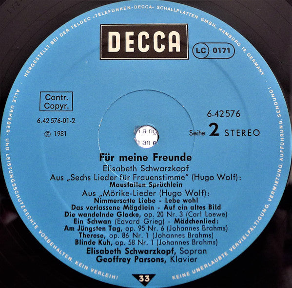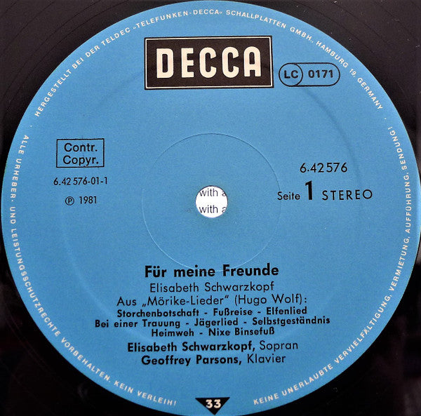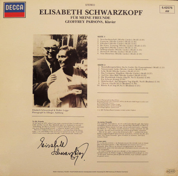 Spine string: "6.442576 AW Elisabeth Schwarzkopf: Für Meíne Freúnde 6.425765 AW".