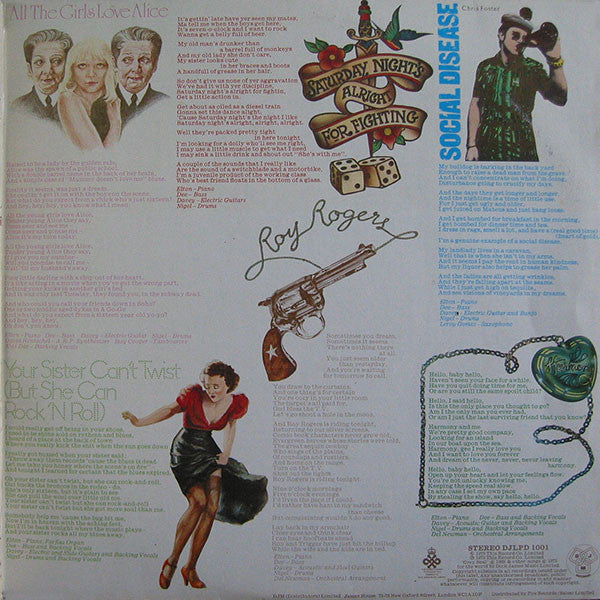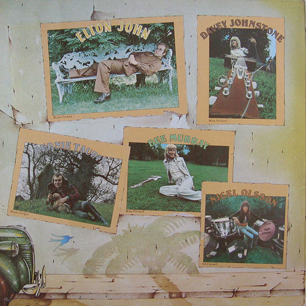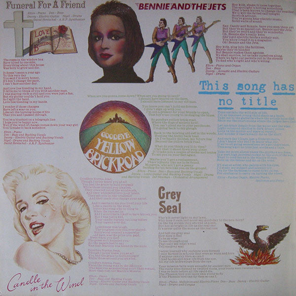 Different label layout compared to [r1336327 Track A1 'Funeral For A Friend / Love Lies Bleeding' each has separate credits though is on one track. Track A3 is spelt on sleeve as 'Bennie And The Jets', and on vinyl labels as 'Benny And The Jets'. 'Grey Seal' (C) 1969 & other songs (C) 1973 for the world by Dick James Music Limited. Information on sleeve: DJM (Distributors) Limited. James House, 71-75 New Oxford Street, London WC1A 1DP. Distributed by Pye Records (Sales) Limited. (C) 1973 This Record Co. Limited. (P) 1973 This Record Co. Limited.