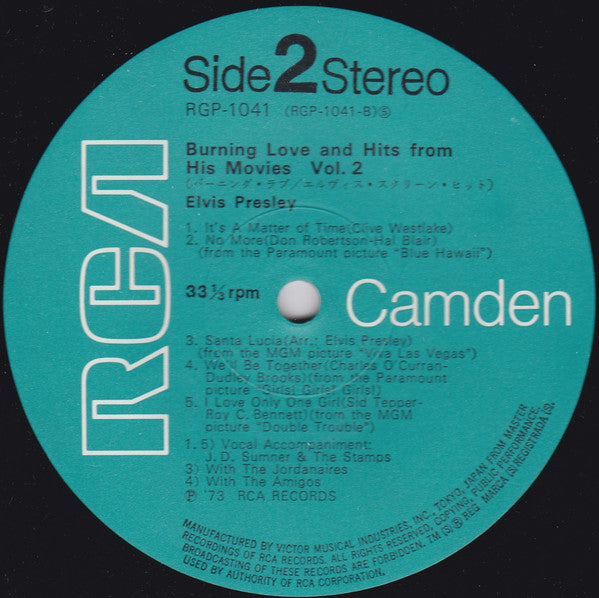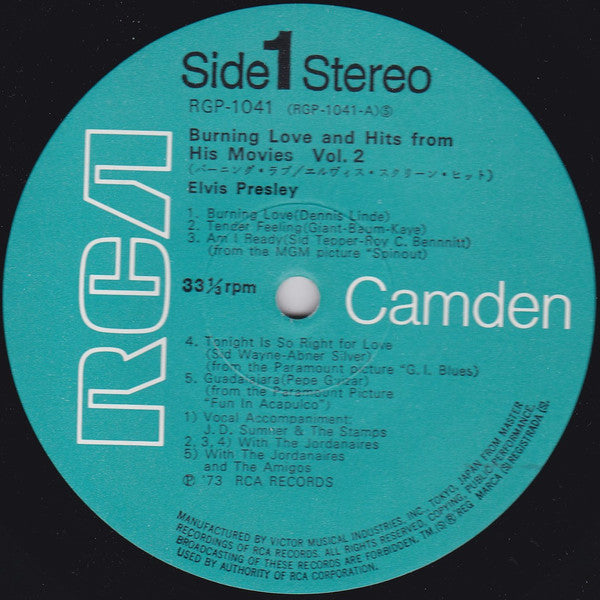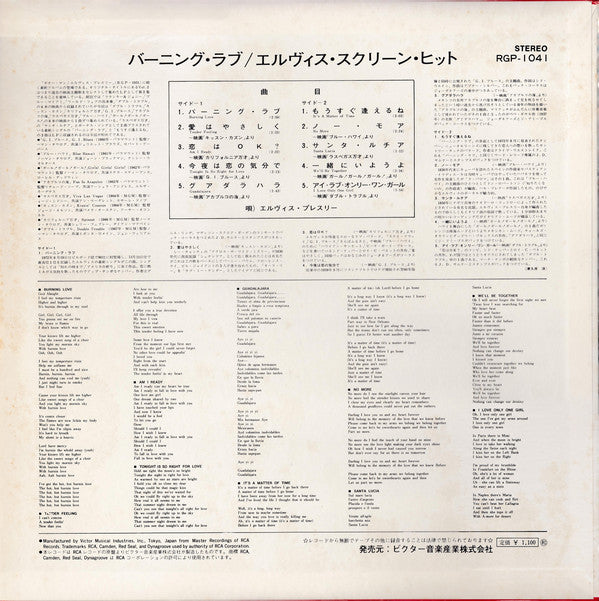 A1. バーニング・ラブ = Burning Love 2:50 A2. 愛はやさしく = Tender Feeling 2:33 A3. 恋はOK? = Am I Ready 2:22 A4. 今夜は恋の気分で = Tonight Is So Right For Love 2:13 A5. グアダラハラ = Guadalajara 2:43 B1. もうすぐ逢えるね = It's A Matter Of Time 3:03 B2. ノー・モア = No More 2:24 B3. サンタ・ルチア = Santa Lucia 1:12 B4. 一緒にいようよ = We'll Be Together 2:16 B5. アイ・ラブ・オンリー・ワン・ガール = I Love Only One Girl 1:54