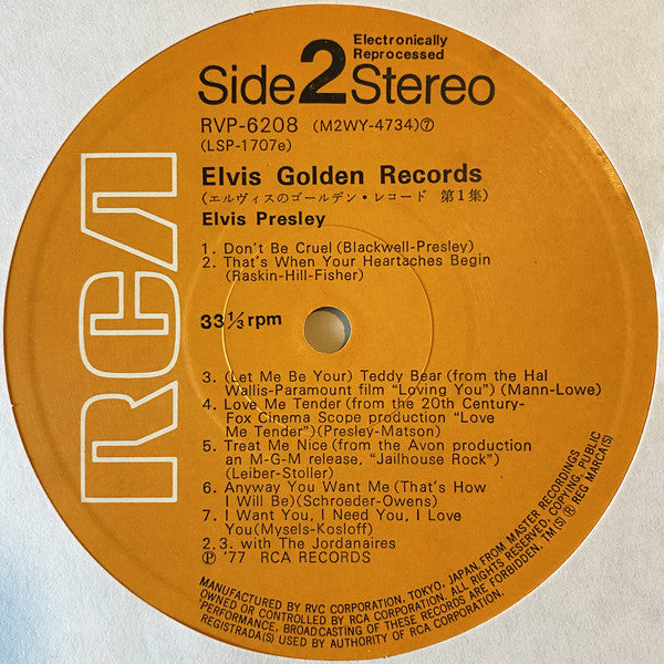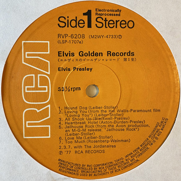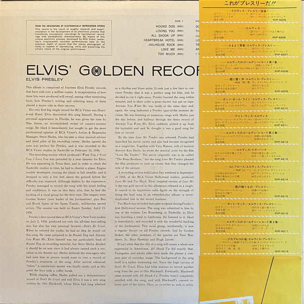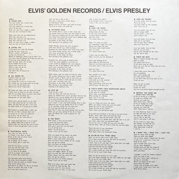 A1. Hound Dog A2. Loving You A3. All Shook Up A4. Heartbreak Hotel A5. Jailhouse Rock A6. Love Me A7. Too Much B1. Don't Be Cruel B2. That's When Your Heartaches Begin B3. (Let Me Be Your) Teddy Bear B4. Love Me Tender B5. Treat Me Nice B6. Anyway You Want Me (That's How I Will Be) B7. I Want You, I Need You, I Love You