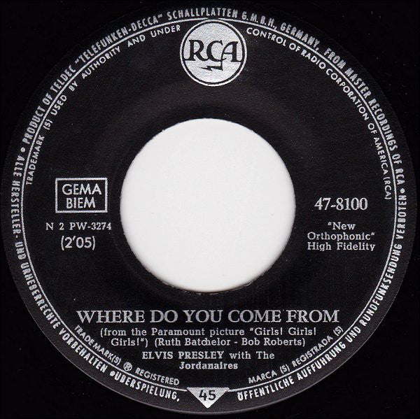 A. Elvis Presley, The Jordanaires - Return To Sender (From The Paramount Picture "Girls! Girls! Girls!") 2:05B. Elvis Presley, The Jordanaires - Where Do You Come From (From The Paramount Picture "Girls! Girls! Girls!") 2:05
