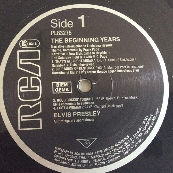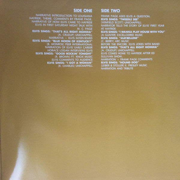 A1a. David Kent (12) - Narrative , Introduction To Louisiana Hayride, A1b. Unknown Artist - Theme A1c. Frank Page (2) - Comments, by Frank Page A1d. David Kent (12), Frank Page (2) - Narrative Of How Elvis Came To First Saturday Night Talk With M.C. Page A1e. Elvis Presley - That's All Right Momma 1:46A1f. David Kent (12) - Narrative + Elvis Interviewed A1g. Elvis Presley - Blue Moon Of Kentucky 2:08A1h. David Kent (12) - Narration Of Elvis' Early Career A1i. Horace Logan, Elvis Presley - Horace Logan Interviews Elvis A1j. Elvis Presley - Good Rockin' Tonight 1:52A1k. Elvis Presley - Comments To Audience A1l. Elvis Presley - I Got A Woman 2:24B1a. Frank Page (2) - Frank Page Asks Elvis A Question B1b. Elvis Presley - Tweedle Dee 2:16B1c. David Kent (12) - Narrator Tells The Story Of Elvis' First Year At Hayride 4:12B1d. Elvis Presley - I Wanna Play House With You B1e. Elvis Presley - Maybellene 2:54B1f. Elvis Presley - Before The Encore Elvis Jokes With Band B1g. Elvis Presley - That's Allright Momma 2:48B1h. Frank Page (2), David Kent (12) - Elvis Comes Home To Hayride After Ed Sullivan Show, Narration + Frank Page Comments B1i. Elvis Presley - Hound Dog 6:49B1j. David Kent (12) - Narration And Tribute