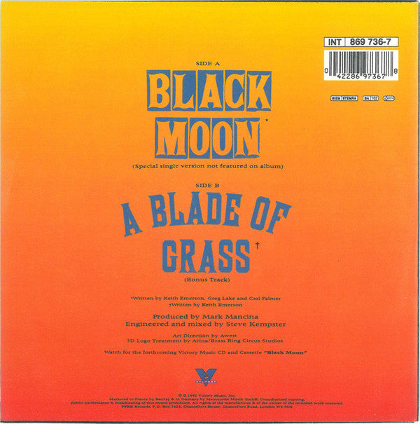 [labels ℗ 1992 Victory Music, Inc. Made in Germany A: Keith Emerson, Greg Lake, Carl Palmer / Spincharm Limited (ASCAP) B: Keith Emerson/Spincharm Limited (ASCAP) [backsleeve Watch fo the forthcoming Victory Muasic CD and Cassette "Black Moon" ℗ © 1992 Victory Music, Inc. Marketed in France by Barclay & in Germany by Metronome Musik GmbH