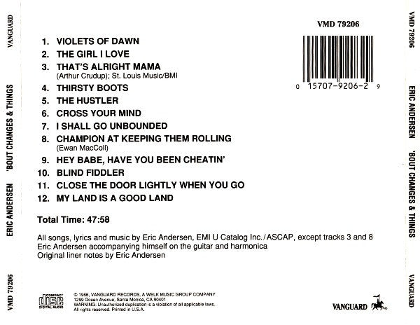 1. Violets Of Dawn 3:472. The Girl I Love 3:003. That's Alright Mama 2:234. Thirsty Boots 5:525. The Hustler 3:596. Cross Your Mind 4:547. I Shall Go Unbounded 6:118. Champion At Keepin' Them Rollin' 2:409. Hey Babe, Have You Been Cheatin' 3:0510. Blind Fiddler 5:0911. Close The Door Lightly When You Go 3:2912. My Land Is A Good Land 2:58