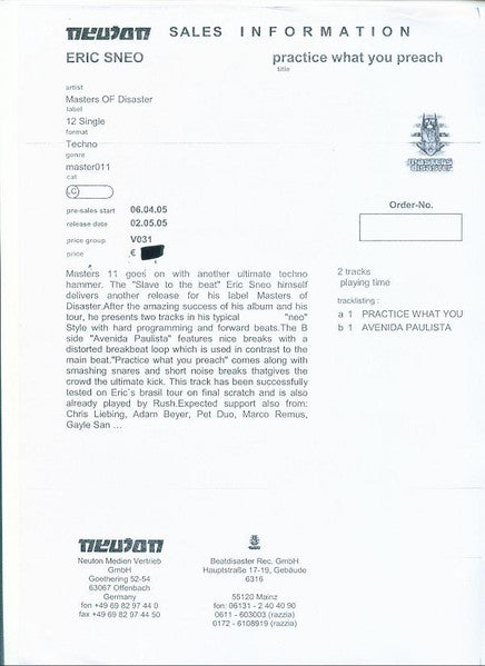 Eric Sneo - Practice What You Preach (12", Promo, W/Lbl, Sti)