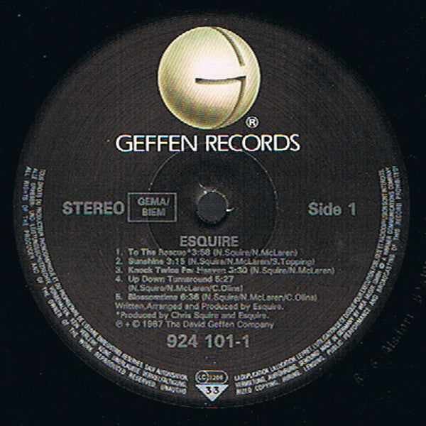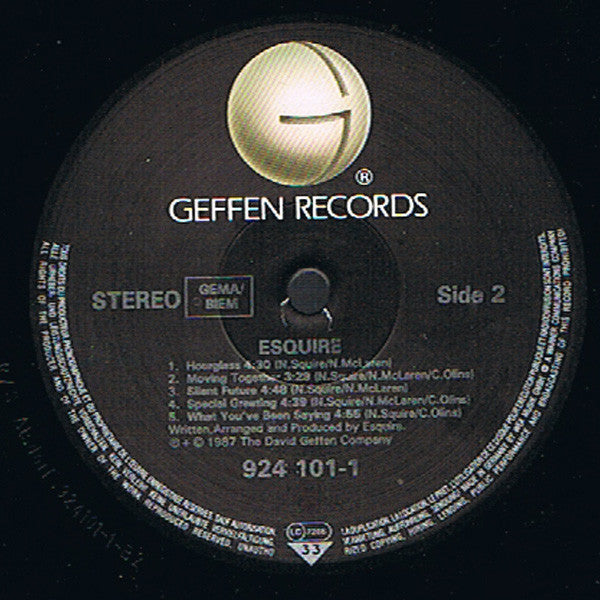 Comes with printed inner. Written, arranged, and produced by Esquire. Esquire is: Nikki Squire Nigel McLaren Charles Olins Esquire was originally signed to Trevor Horn's ZTT label but he never had time to work on their record. The full story is detailed on the back of their promo-only 12" singles. Thanks to Jill Sinclair. UPC: 07599241011x (missing check digit)