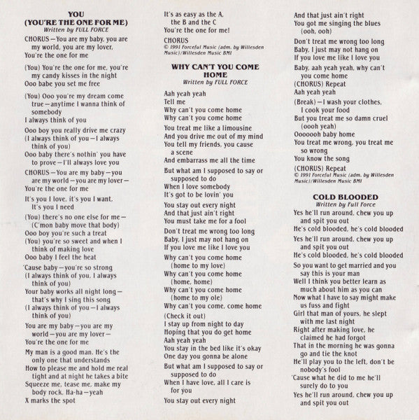 All tracks © 1991 Forceful Music, adm. by Willesden Music / Willesden Music (BMI), except track 8 © 1970 Jobete Music Co. Inc. (ASCAP) and track 16 © 1991 Unlimited Touch (ASCAP) / Trumar Music (BMI). Produced and arranged for Forceful Records, Inc. Recorded and mixed at Sound Lab Studios, N.Y. Mastered at Masterdisk, N.Y.