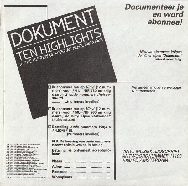 Printed: "Deze flexidisc is een uitgave van Muziekblad Vinyl, Postbus 14520, 1001 LA Amsterdam, tel. 020 - 249226"