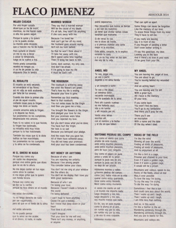 A1. Mujer Casada 2:45 A2. La Paloma 2:30 A3. El Rosalito 3:15 A4. El Cerrito 2:05 A5. Ni El Dinero Ni Nada 4:05 A6. Angel Mio 2:30 A7. Gritenme Piedras Del Campo 3:25 B1. Tu Nuevo Carinito 2:40 B2. El Gallito 2:20 B3. Morenita Mia 3:50 B4. La Piedrera 2:10 B5. Dos Corazones 2:40 B6. Spanish Ice 3:30 B7. Vuelve A Quererme 3:05