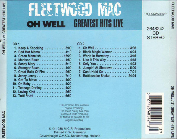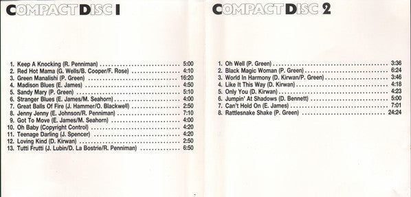 1-1. Keep A Knocking 5:001-2. Red Hot Mama 4:101-3. Green Manalishi 16:201-4. Madison Blues 4:501-5. Sandy Mary 5:101-6. Stranger Blues 4:001-7. Great Balls Of Fire 2:501-8. Jenny Jenny 7:101-9. Got To Move 4:001-10. Oh Baby 4:201-11. Teenage Darling 4:201-12. Loving Kind 2:501-13. Tutti Frutti 6:502-1. Oh Well 3:362-2. Black Magic Woman 6:242-3. World In Harmony 3:462-4. Like It This Way 4:182-5. Only You 4:232-6. Jumpin' At Shadows 5:002-7. Can't Hold On 7:012-8. Rattlesnake Shake 24:24