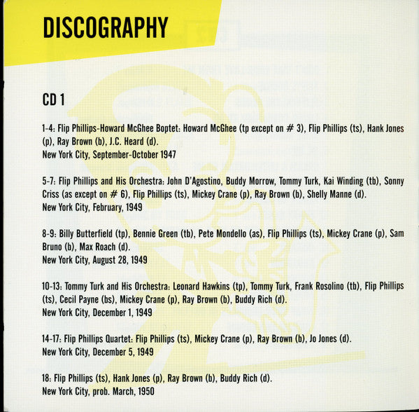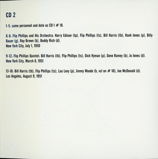 1-1. The Flip Phillips-Howard McGhee Boptet - Cake 1-2. The Flip Phillips-Howard McGhee Boptet - Znarg Blues 1-3. The Flip Phillips-Howard McGhee Boptet - My Old Flame 1-4. The Flip Phillips-Howard McGhee Boptet - Cool 1-5. Flip Phillips And His Orchestra - Put That Back 1-6. Flip Phillips And His Orchestra - Lazy River 1-7. Flip Phillips And His Orchestra - Flip's Idea 1-8. Flip Phillips And His Orchestra - This Can't Be Love 1-9. Flip Phillips And His Orchestra - Cookie 1-10. Tommy Turk And His Orchestra - Two By Four 1-11. Tommy Turk And His Orchestra - Bye Bye Blues 1-12. Tommy Turk And His Orchestra - Encore 1-13. Tommy Turk And His Orchestra - The Beat 1-14. Flip Phillips Quartet - Drowsy 1-15. Flip Phillips Quartet - Vortex 1-16. Flip Phillips Quartet - Milano 1-17. Flip Phillips Quartet - But Beautiful 1-18. Flip Phillips Quartet - Lover 2-1. Flip Phillips Quartet - Don't Take Your Love From Me 2-2. Flip Phillips Quartet - Flip's Boogie 2-3. Flip Phillips Quartet - Flippin' The Blues 2-4. Flip Phillips Quartet - Lover Come Back To Me 2-5. Flip Phillips Quartet - Blue Room 2-6. Flip Phillips And His Orchestra - Be Be 2-7. Flip Phillips And His Orchestra - Dream A Little Dream Of Me 2-8. Flip Phillips And His Orchestra - Bright Blues 2-9. The Flip Phillips Quintet - Cheek To Cheek 2-10. The Flip Phillips Quintet - Funky Blues 2-11. The Flip Phillips Quintet - I've Got My Love To Keep Me Warm 2-12. The Flip Phillips Quintet - Indiana 2-13. The Flip Phillips Quintet - Broadway 2-14. The Flip Phillips Quintet - Sojoro 2-15. The Flip Phillips Quintet - Apple Honey 2-16. The Flip Phillips Quintet - Wrap Your Troubles In Dreams 2-17. The Flip Phillips Quintet - Long Island Boogie 2-18. The Flip Phillips Quintet - Stardust