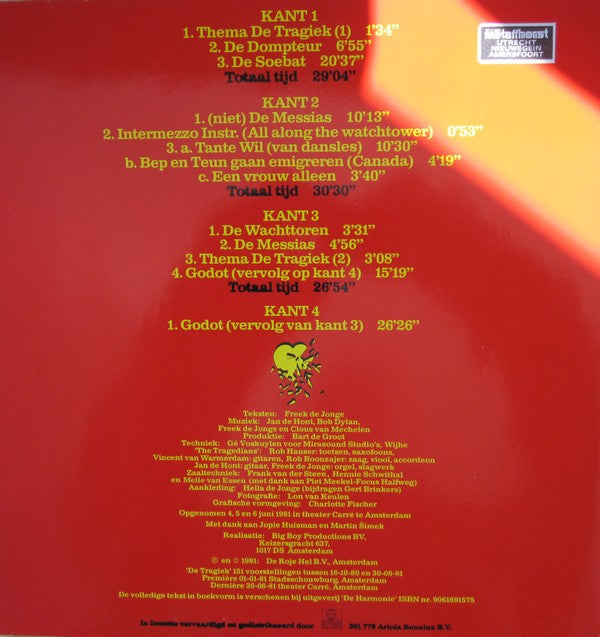 A1. Thema De Tragiek (1) 1:34 A2. De Dompteur 6:55 A3. De Soebat 20:37 B1. (Niet) De Messias 10:13 B2. Intermezzo Instr. (All Along The Watchtower) 0:53 B3.a. Tante Wil (Van Dansles) 10:30 B3.b. Bep En Teun Gaan Emigreren (Canada) 4:19 B3.c. Een Vrouw Alleen 3:40 C1. De Wachttoren 3:31 C2. De Messias 4:56 C3. Thema De Tragiek (2) 3:08 C4. Godot (Vervolg Op Kant 4) 15:19 D1. Godot (Vervolg Van Kant 3) 26:26