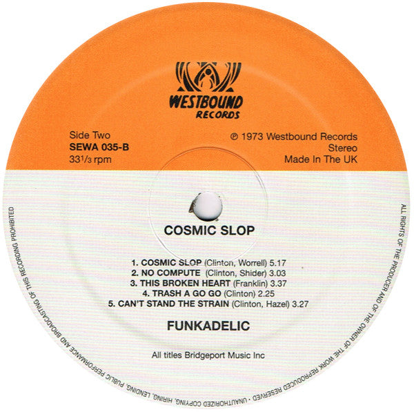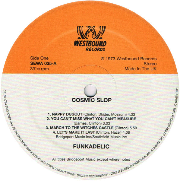 A1. Nappy Dugout 4:33 A2. You Can't Miss What You Can't Measure 3:03 A3. March To The Witch's Castle 5:59 A4. Let's Make It Last 4:08 B1. Cosmic Slop 5:17 B2. No Compute 3:03 B3. This Broken Heart 3:37 B4. Trash-A-Go-Go 2:25 B5. Can't Stand The Strain 3:27