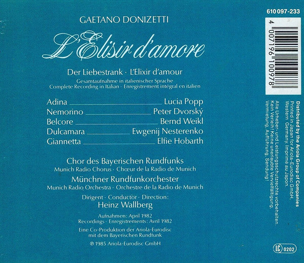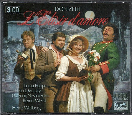 1-1. Bel Conforto Al Mietiore 5:011-2. Quanto E Bella, Quanto E Cara 3:071-3. Benedette Queste Carte!-Della Crudele Isotta 4:431-4. Come Paride Vezzoso 8:551-5. Intanto O Mia Ragazza 0:391-6. Una Parola, O Adina 1:391-7. Chiedi All'aura Lusinghiera 7:151-8. Che Vuol Dire Cotesta Suonata? 1:581-9. Udite, Udite, O Rustici! 7:321-10. Ardir! Ha Forse Il Cielo-Voglio Dire..Lo Stupendo Elisir 7:002-1. Caro Elisir! Sei Mio!-Chi E Mai Quel Matto? 7:392-2. Tran, Tran, Tran-In Guerra Ed In Amor 3:162-3. Signor Sargente 10:192-4. Cantiamo, Cantiam 2:322-5. Poiche Cantar Vi Alletta-Io Son Ricco E Tu Sei Bella 3:102-6. Silenzio! E Qua Il Notaro 0:472-7. Cantiamo, Cantiam 1:302-8. Le Feste Nuziali 1:562-9. La Donna E Un Animale-Venti Scudi! 8:483-1. Saria Possibile? Possibilissimo 3:463-2. Dell'elsir Mirabile-Che Vedo? 7:213-3. Come Sen Va Contento! - Quanto Amore! 8:103-4. Una Furtive Lagrima 4:163-5. Eccola - Nemorino Ebbene? 1:373-6. Prendi, Per Me Sei Libero - Or, Or Si Spiega 8:003-7. Alto? Fronte! Che Vedo? 1:583-8. Ei Corregge Ogni Difetto 2:38