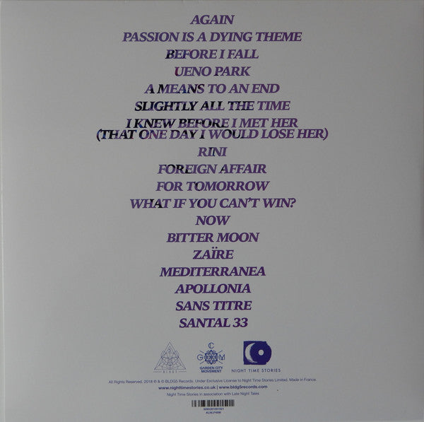 A1. Again A2. Passion Is A Dying Theme A3. Before I Fall A4. Ueno Park A5. A Means To An End B1. Slightly All The Time B2. I Knew Before I Met Her (That One Day I Would Lose Her) B3. Rini B4. Foreign Affair C1. For Tomorrow C2. What If You Can't Win? C3. Now C4. Bitter Moon C5. Zaïre D1. Mediterranea D2. Apollonia D3. Sans Titre D4. Santal 33