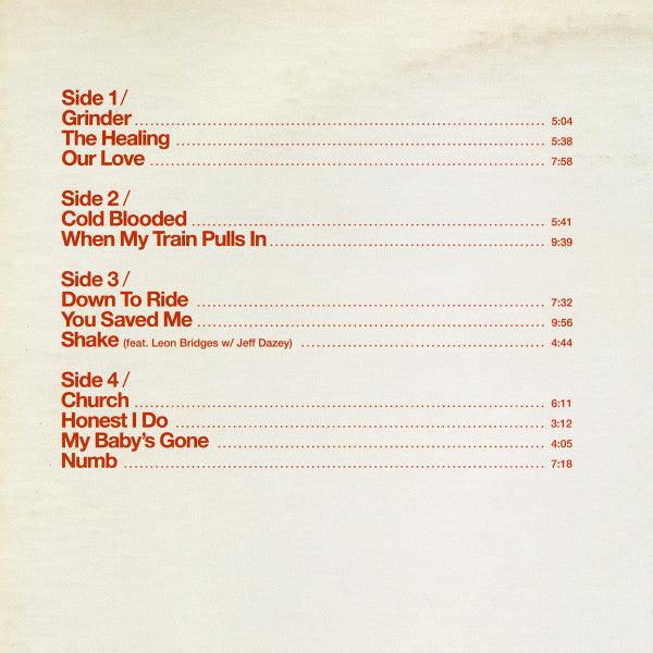 A1. Grinder 5:04 A2. The Healing 5:38 A3. Our Love 7:58 B1. Cold Blooded 5:41 B2. When My Train Pulls In 9:39 C1. Down To Ride 7:32 C2. You Saved Me 9:56 C3. Shake 4:44 D1. Church 6:11 D2. Honest I Do 3:12 D3. My Baby's Gone 4:05 D4. Numb 7:18