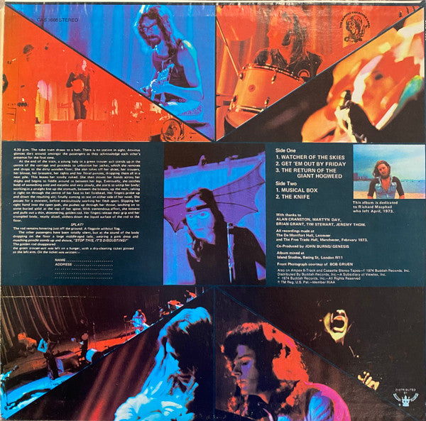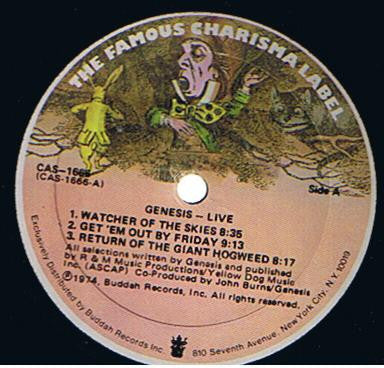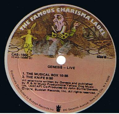 A1. Watcher Of The Skies 8:35 A2. Get 'Em Out By Friday 9:13 A3. The Return Of The Giant Hogweed 8:17 B1. Musical Box 10:55 B2. The Knife 9:50