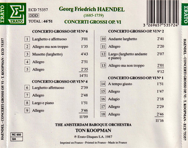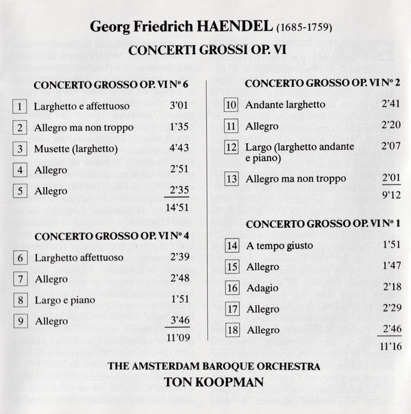 . Concerto Grosso Op. VI No. 6 14:51. Concerto Grosso Op. VI No. 4 11:09. Concerto Grosso Op. VI No. 2 9:12. Concerto Grosso Op. VI No. 1 11:16