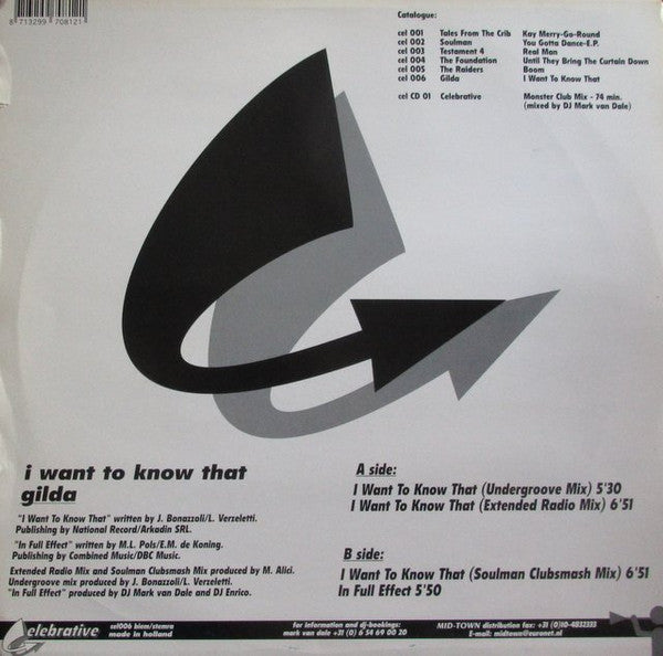 A1. I Want To Know That (Undergroove Mix) 5:30 A2. I Want To Know That (Extended Radio Mix) 6:51 B1. I Want To Know That (Soulman Clubsmash Mix) 6:51 B2. In Full Effect 5:50