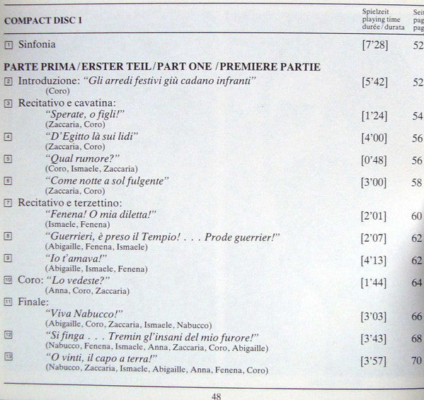 . Nabucco – Dramma Lirico In Quattro Parti 1.1. Sinfonia 1.2-1.13. Parte Prima: Gerusalemme - I - 1.14-1.17. Parte Prima: Gerusalemme - II - 1.18-1.20. Parte Seconda: L'Empio - I - 2.1-2.5. Parte Seconda: L'Empio - II - 2.6-2.11. Parte Terza: La Profezia - I - 2.12-2-14. Parte Terza: La Profezia - II - 2.15-2.18. Parte Quarta: L'Idolo Infrantro - I - 2.19-2.24. Parte Quarta: L'Idolo Infrantro - II -